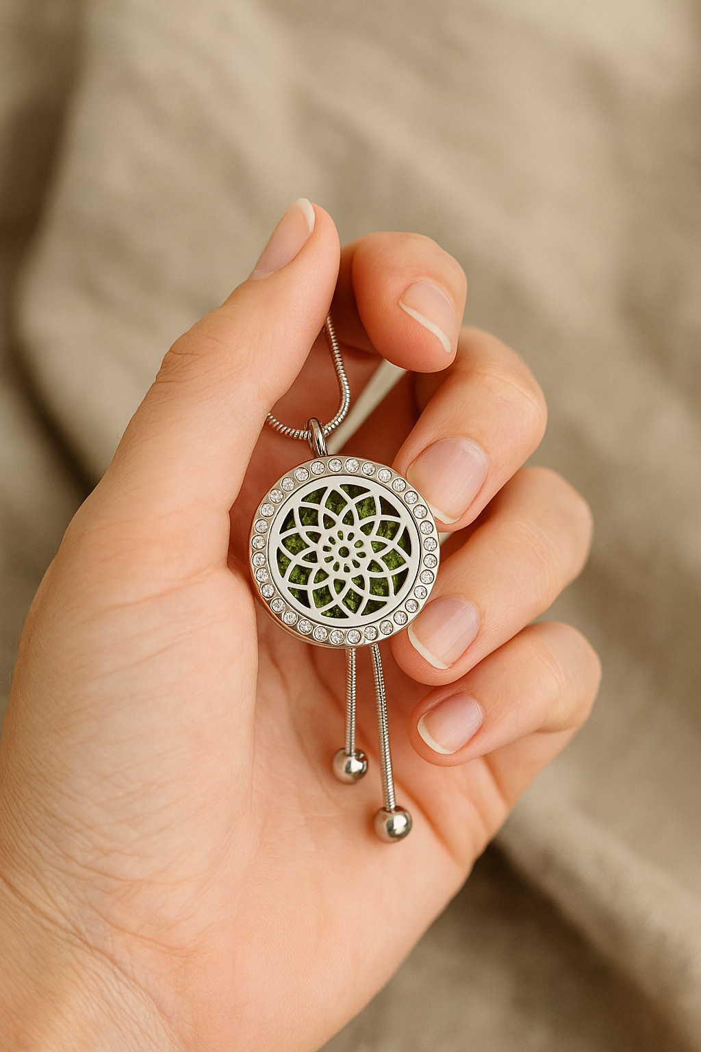 Dépose quelques gouttes de ton huile essentielle ou de ton parfum sur le pad, referme le bijou, et laisse toi envelopper toute la journée.